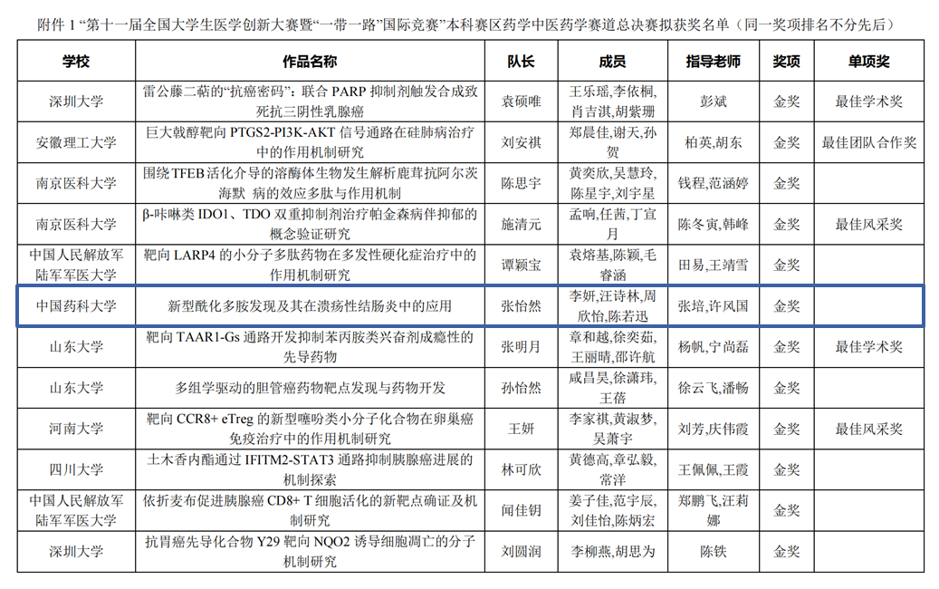 近日,第十一届全国老员工医学创新大赛暨2025“一带一路”国际竞赛全国总决赛在山东大学圆满落幕,由来自PA捕鱼官方网站、基础医学与临床药学公司本科生组成的公司代表队(成员:张怡然、李妍、汪诗林、周欣怡、陈若迅,指导教师:张培、许风国)表现优异,参赛项目《新型酰化多胺发现及其在溃疡性结肠炎中的应用》荣获药学中医药学赛道全国总决赛金奖。